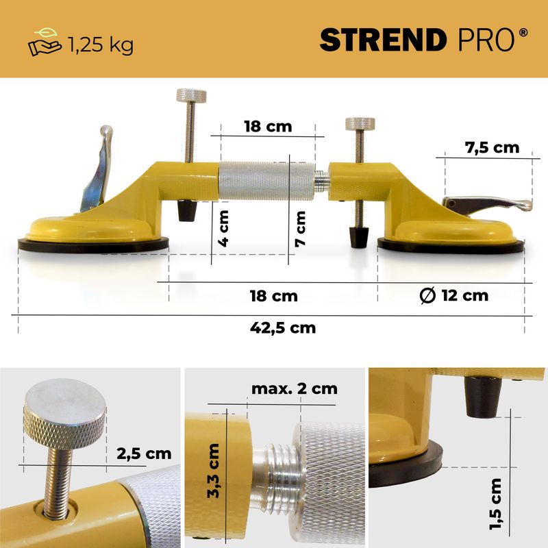 A Strend Pro üvegtartó ideális csempe, csempe, üveg, műanyag, rétegelt lemezek, kőlapok és karosszériajavítások emelésére. Nagyszerű3in1segítő –nem porózus anyagok emeléséhez, fugák definiálásához – a tapadókorong lehetővé teszi a csempe pontos mozgatását 0-40mm között és kiegyenlítését – az üvegtartó 2 csavarral érkezik a csempe 0-20mm közötti magasságkülönbségek kiküszöbölésére. Anyaga : alu+gumi. Maximális terhelhetőség: 80 kg.